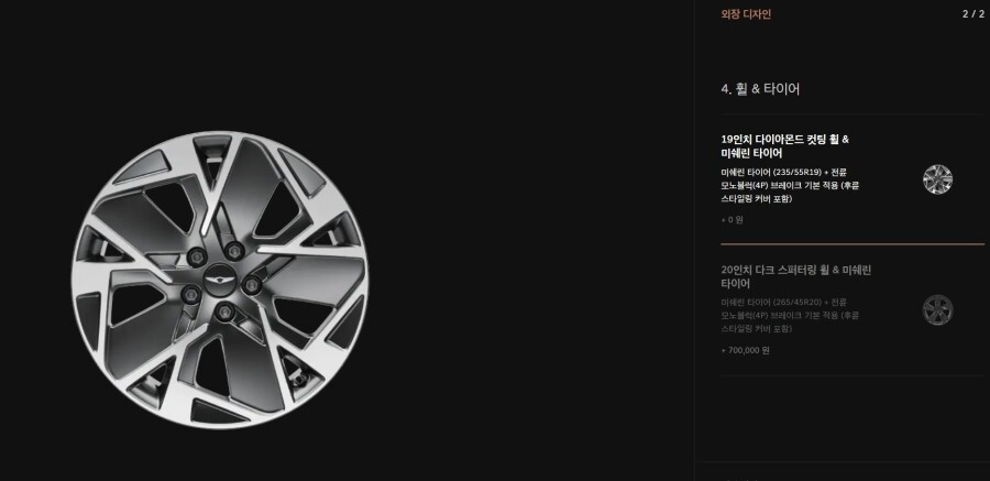 여기에 20인치로 변경하면 70만원이 추가되는데 예상보다 가격이 저렴한 느낌이네요.