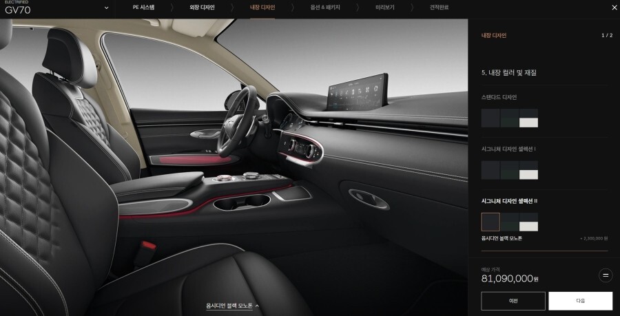 내장 디자인은 기본 스탠다드와 시그니쳐 디자인 셀렉션1과 셀렉션2가 190만원과 230만원에 제공됩니다.