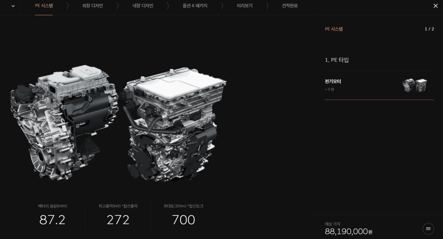 PE는 전기차 엔진을 선택하는 것인데, 아이오닉5나 EV6와 다르게 한 종류만 있고