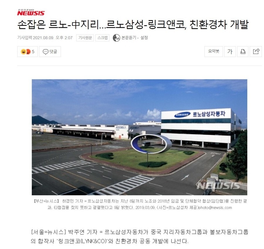 지금 보시는 기사의 내용을 보면 르노삼성과 지리홀딩스가 합작을 하고 2024년도에 합작모델을 출시한다는 내용입니다.