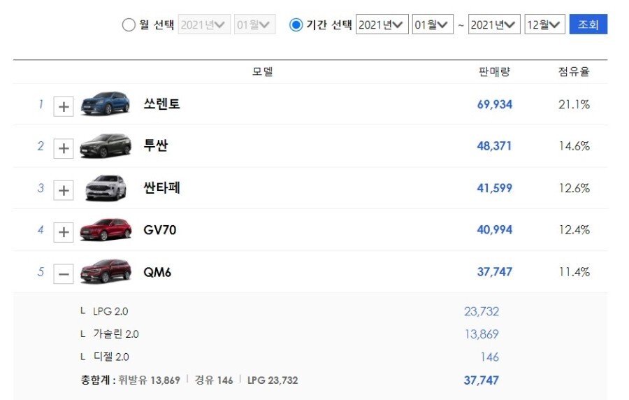 판매량을 구체적으로 보면, QM6는 LPG 차량이 절반 이상을 차지하고 있는데, 작년 한해 동안 23,732대를 국내 시장에 판매했습니다.
