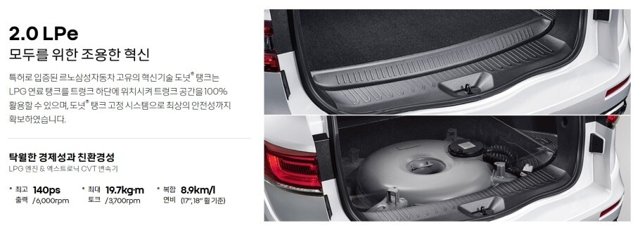 가스통이라고 할 수 있는 도넛형 탱크는 트렁크 바닥에서 제공되며 전고가 높은 SUV 특성상 트렁크 공간도 살릴 수 있다는 장점이 있습니다.