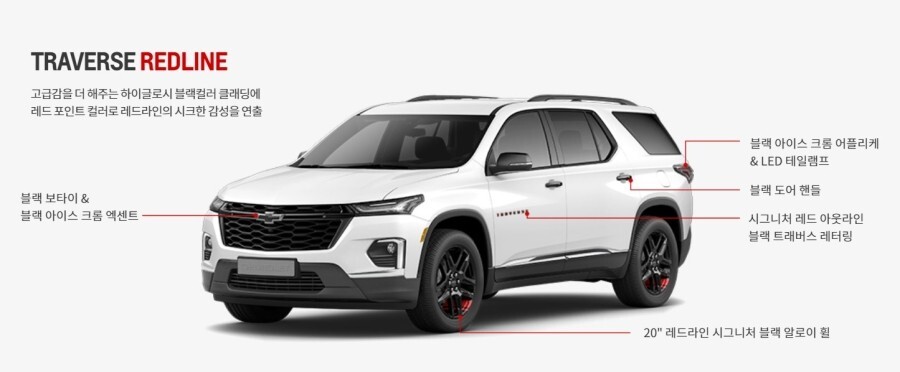 국내에서 레드라인으로 출시가 될 것 같은데 트래버스 처럼 다크 크롬과 RS 전용배지, 블랙 보타이, 전용 휠에 차이를