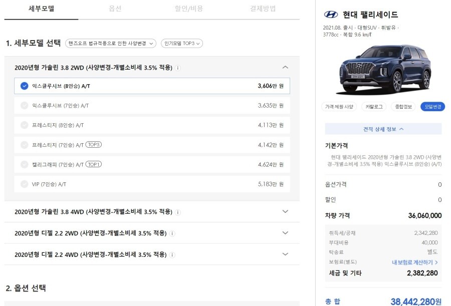 상대적으로 팰리세이드 중간 정도 트림을 구입하는 4천만 중후반의 가격이 저렴해 보이게 됩니다.