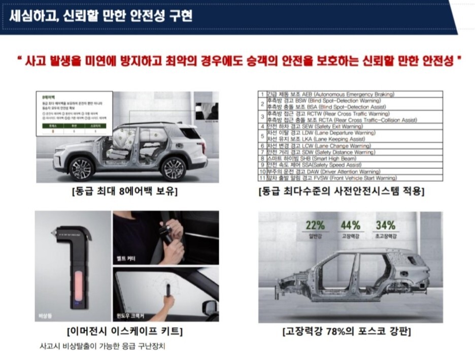투싼과 스포티지 보다 더 많은 숫자의 에어백이 제공된다고는 점을 강조하네요.