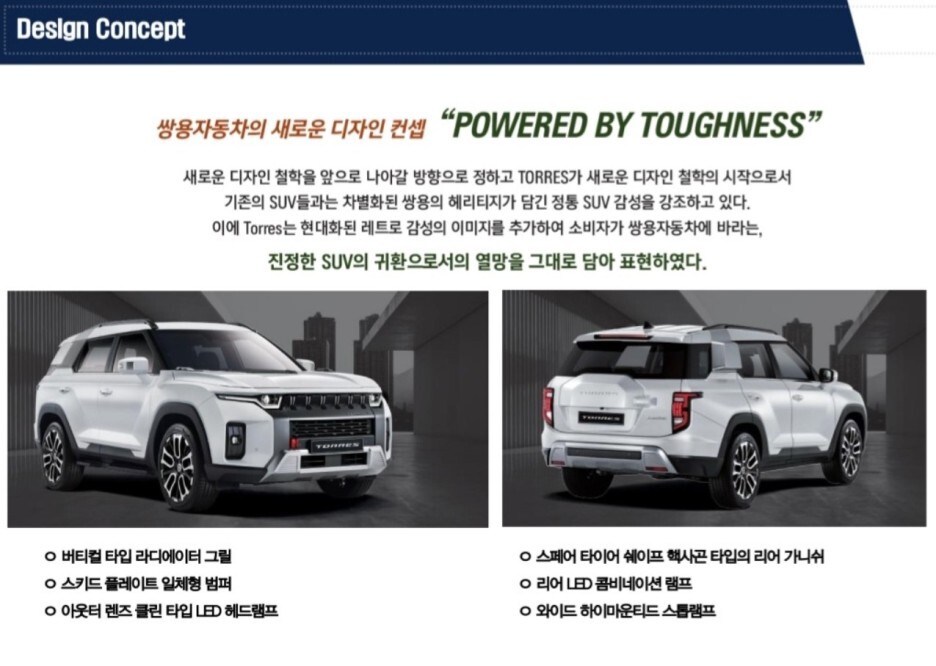 파워드 바이 퍼프니스 레트로함과 쌍용차만의 정통 SUV를 담은 토레스의 키워드인데요.