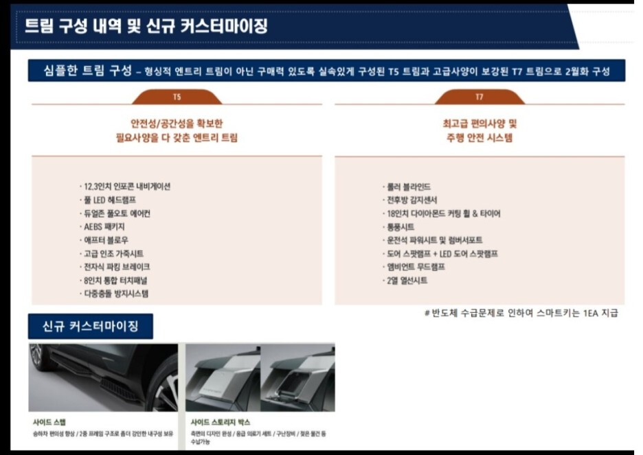 다만 고급형 T7에는 통풍시트와 파워시트, 실내 감성을 높이는 엠비언드 무드램프, 2열 열선시트, 2열 수동 커튼을