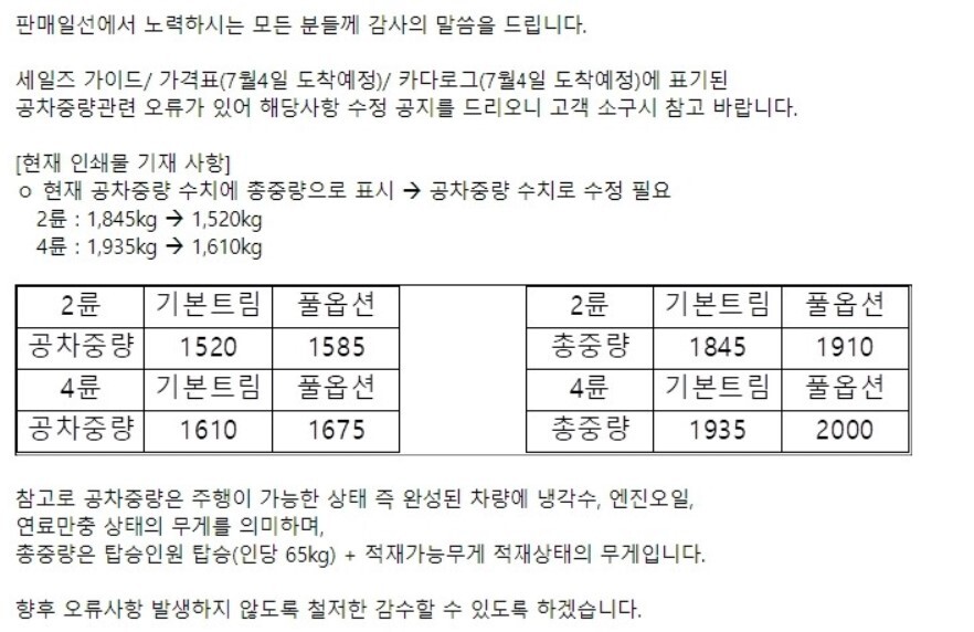 첫 번째가 공차중량과 총 중량에 대한 오타이었는데요.