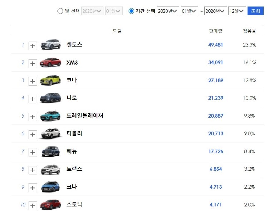 2020년도 소형 SUV 전체 판매량에서 전체 2위를 차지할 정도로 인상적인 모습을 보여주었죠