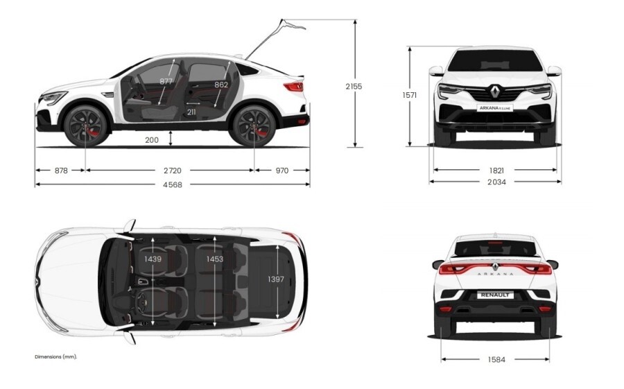 전장이 4,568mm, 전폭 1,821mm, 전고 1,571mm, 휠베이스 2,720mm