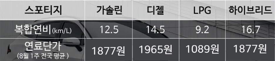 하지만 유류비용을 비교해 보면 LPG는 거의 절반의 가격으로 하이브리드와 비교가 될 수 있겠죠?