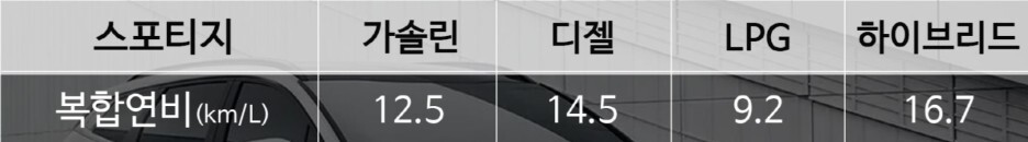 우선 연비부터 비교해 보면, 가솔린 복합연비 12.5km 디젤 14.5 LPG 9.2 하이브리드 16.7 이정도의 차이가 있네요!