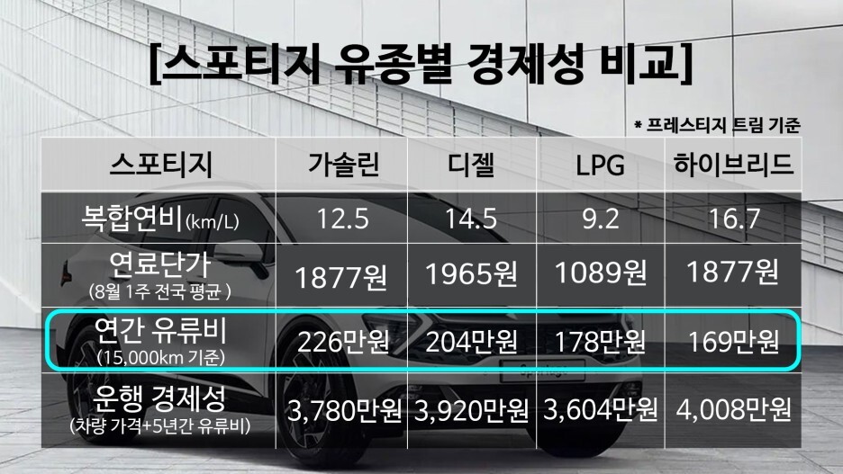 마지막으로 스포티지 엔진별 차량 가격을 더해서 평균 5년 정도 차량을 타기 때문에 #차량가격 에 #5년유류비 를 더해 볼게요!