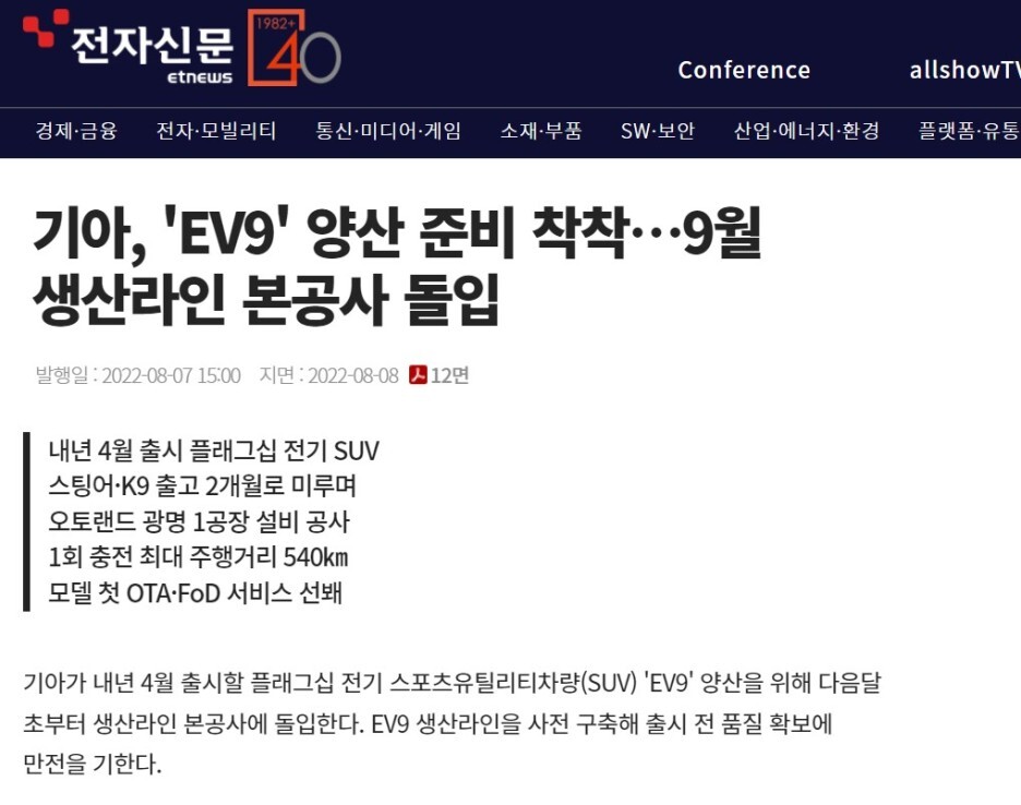 이번 주 전자신문의 보도 자료에 의하면 EV9 양산 준비가 이미 진행되고 있는데..