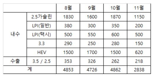 결론적으로 4853대에서 11월에 2838대로 기존 그랜저의 생산량을 자연스럽게 줄인 것을 알 수 있네요!