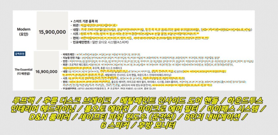 모던 1590만원 183만원을 더하면 1773만원이 되기 때문에 확실히 옵션 구성면에서 디 에센셜이 좋아보이네요!