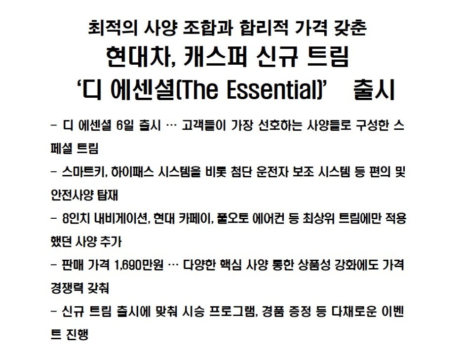 " 캐스퍼! 미친 가성비! 디 에센셜 트림 출시! "