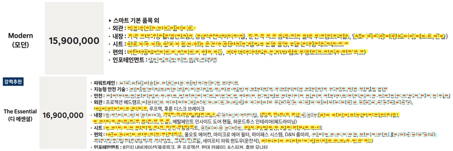 모던 1590만원 183만원을 더하면 1773만원이 되기 때문에 확실히 옵션 구성면에서 디 에센셜이 좋아보이네요!