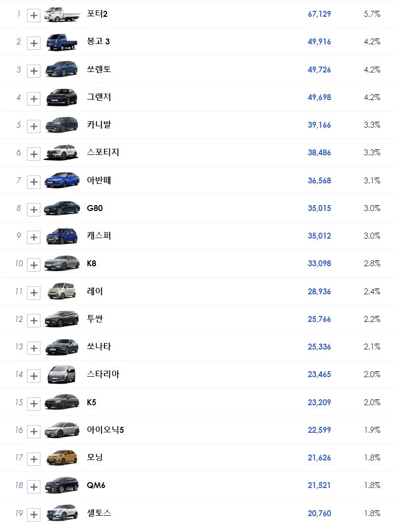 당당히 9위에 이름을 올렸는데 #포터 나 #봉고 를 제외하면 #쏘렌토 , #그랜저 , #카니발 , #스포티지 #아반떼, #G80 다음에