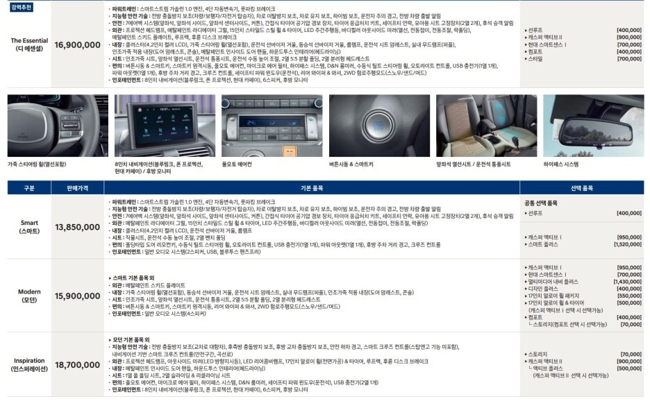 기본 깡통은 스마트 1385만원 / 기본트림 모든 1590만원 / 디 에센셜 1690만원 / 고급트림 인스퍼레이션 1870만원