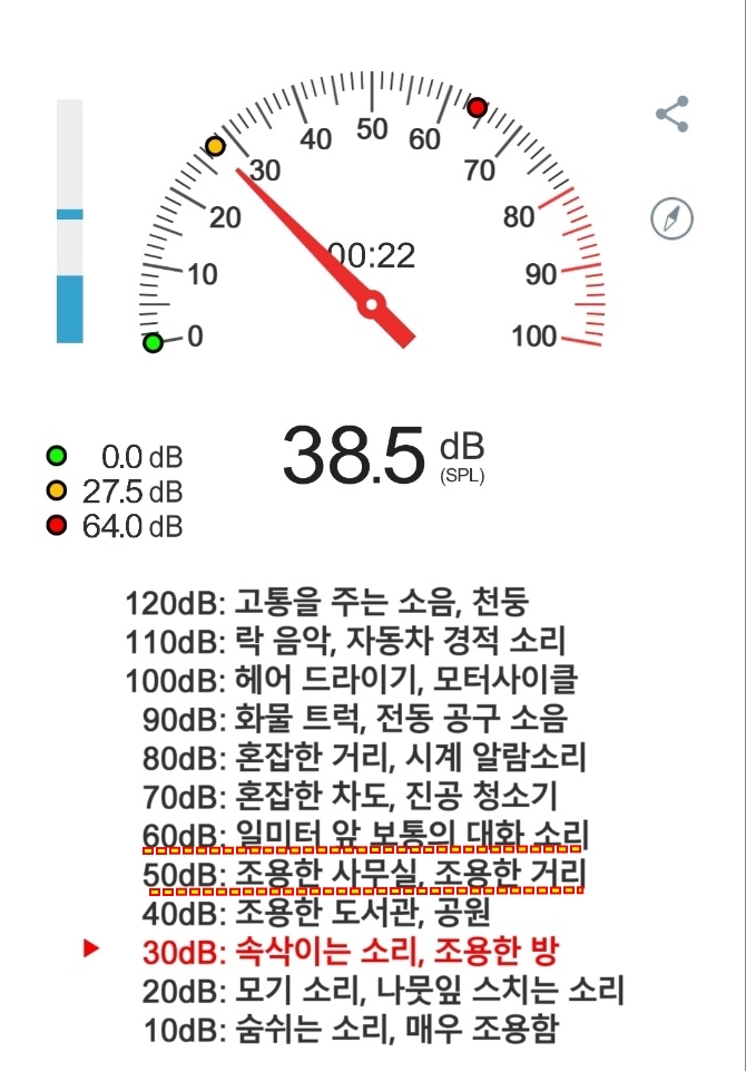 도서관 정도는 아니더라도 이 정도 차이면 누구나 느낄 수 있는 정도라고 할 수 있어요.