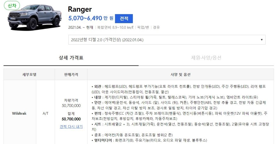 경쟁 군에 있는 포드 레인저의 경우, 시작 가격이 5천만 원대라서