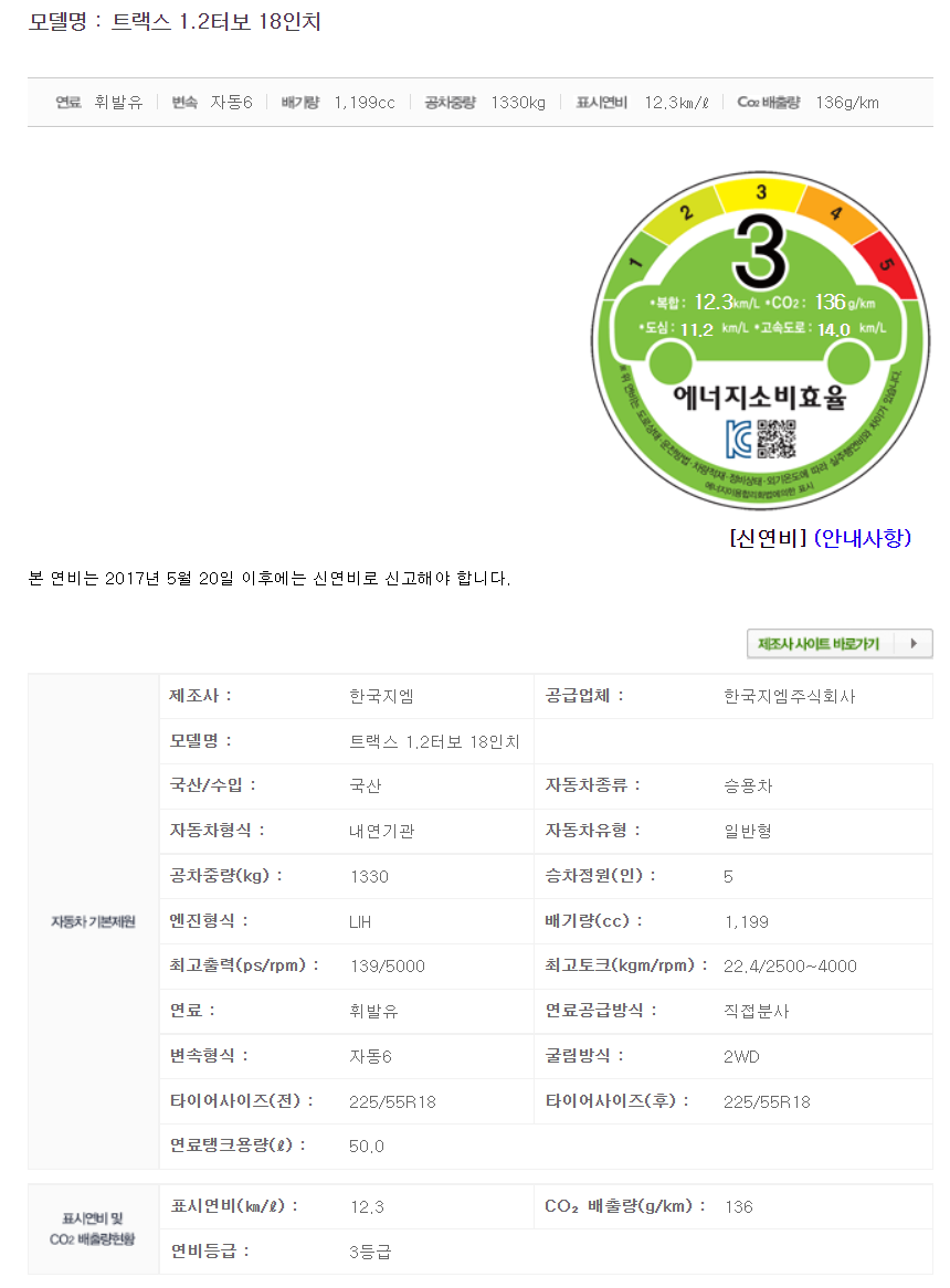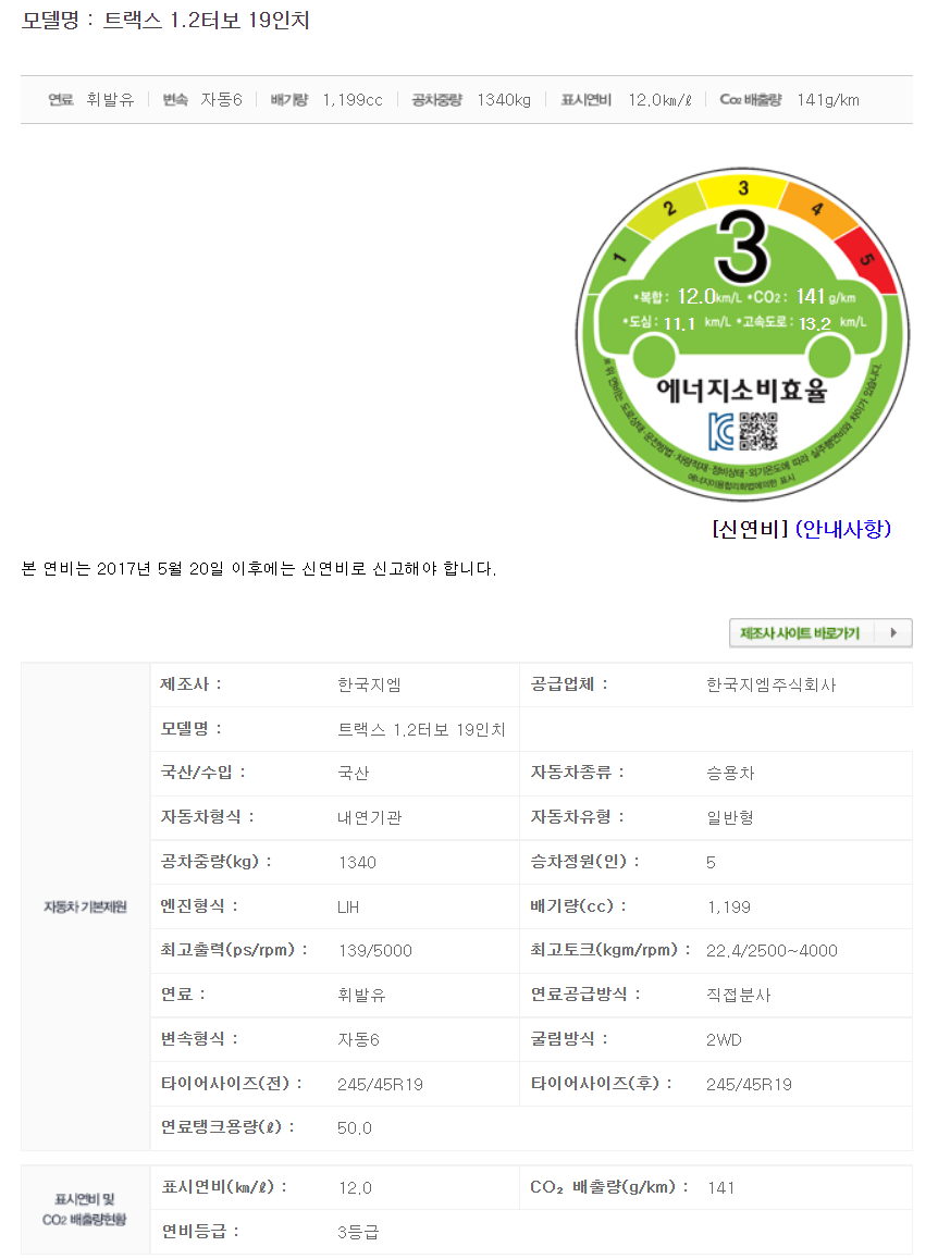 17인치의 연비는 12.9km/L로 신형 트랙스 17인치 12.7km/L 보다 0.2km/L 높네요!