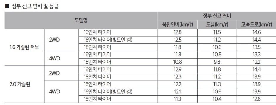 파워트레인 스펙은 동일하니 타이어 차이에 대한 연비만 참고하면 될 것 같네요!