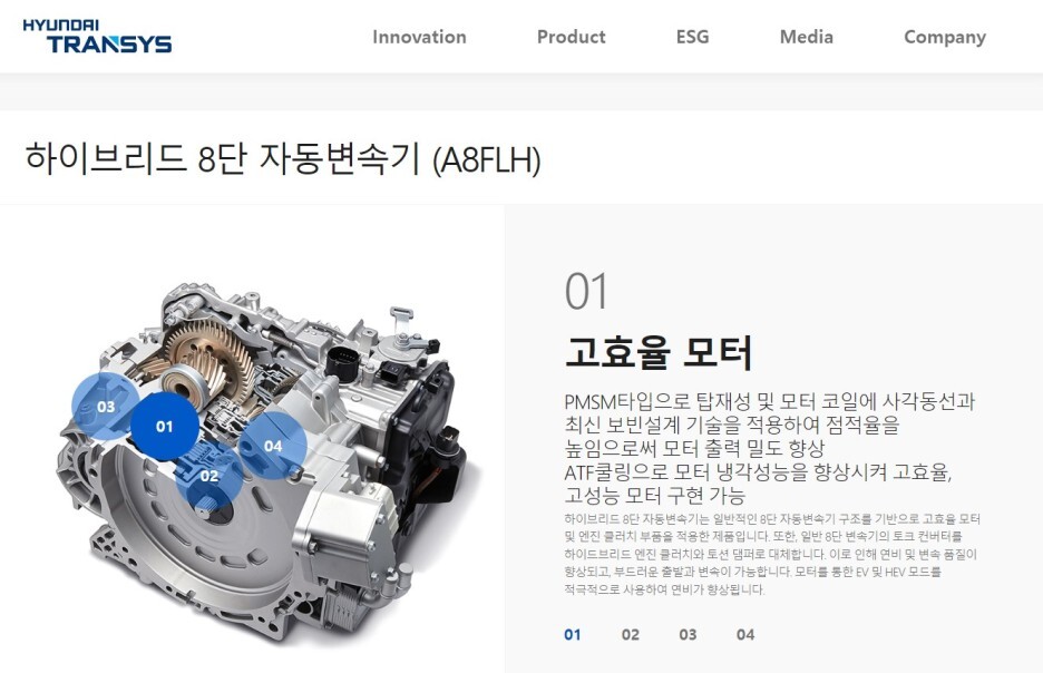 내용을 보면 고효율 모터로 현대에서 최신 차량에 적용된 8단 자동 변속기의 토크 컨버터를 하이브리드 엔진 클러치와 토션 댐퍼로 대체한 변속기입니다.