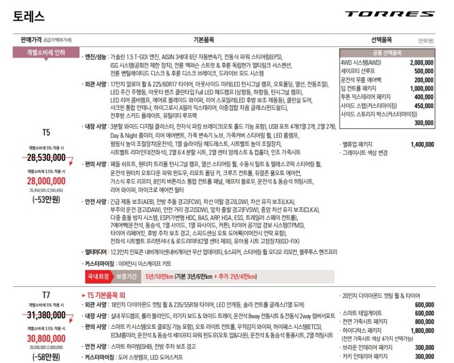 이미 쌍용은 차체&일반부품 및 엔진&구동전달부품 등의 보증기간은 5년/10만km를 제공하고 있죠!