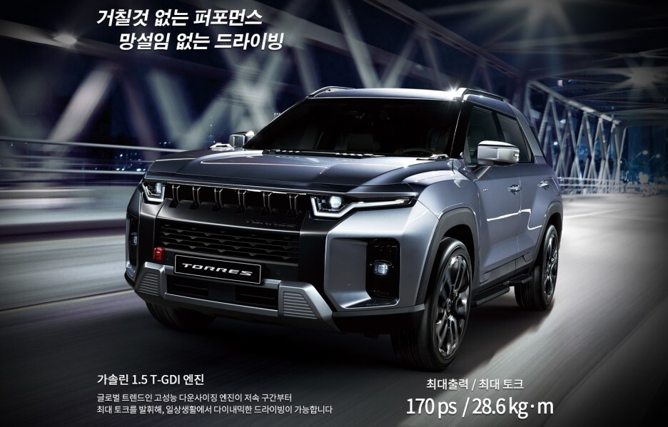 토레스는1.5ℓ GDI 터보 가솔린 엔진은 최고출력(170마력)과 최대토크(28.6kg·m)이죠!