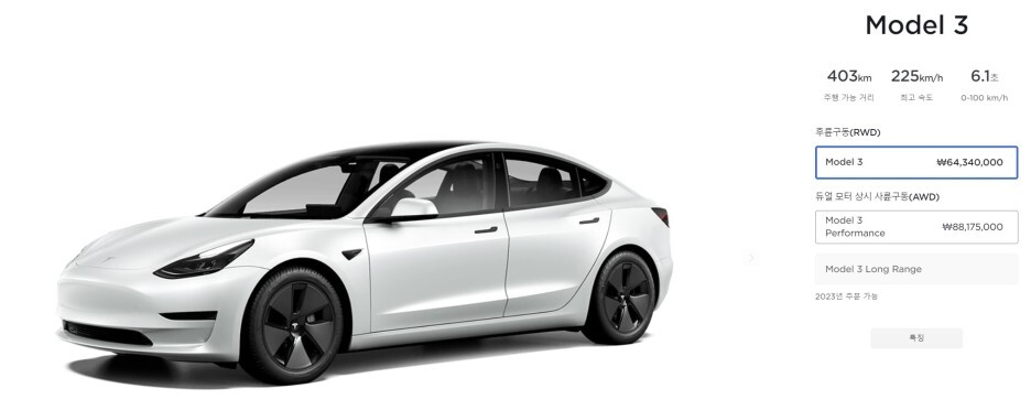 모델3 가격은 6434만 원이며 모델 3 퍼포먼스는 8817.5만 원입니다.