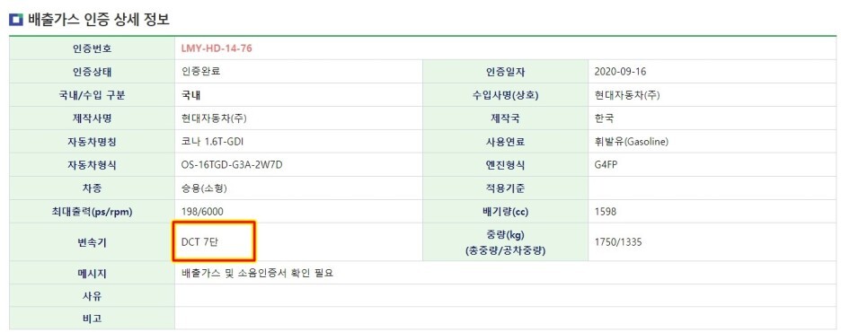 신형 코나의 인증 정보입니다. 드디어 자동 8단 변속기가 제공됩니다.