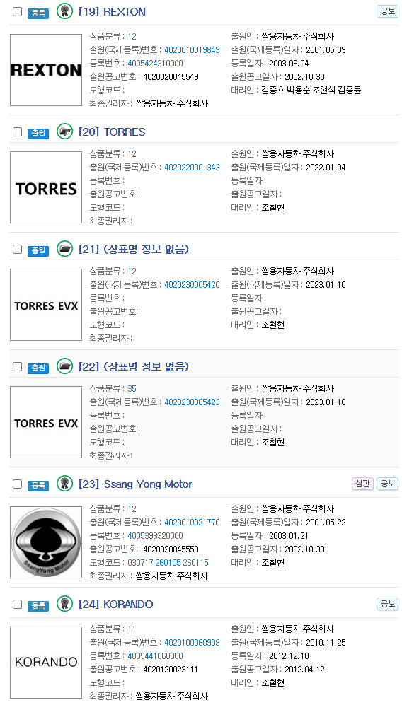특허청 키프리스에서 쌍용자동차로 검색해 보면, 쌍용차는 현대차그룹과 다르게 가능성이 높은 상표명을