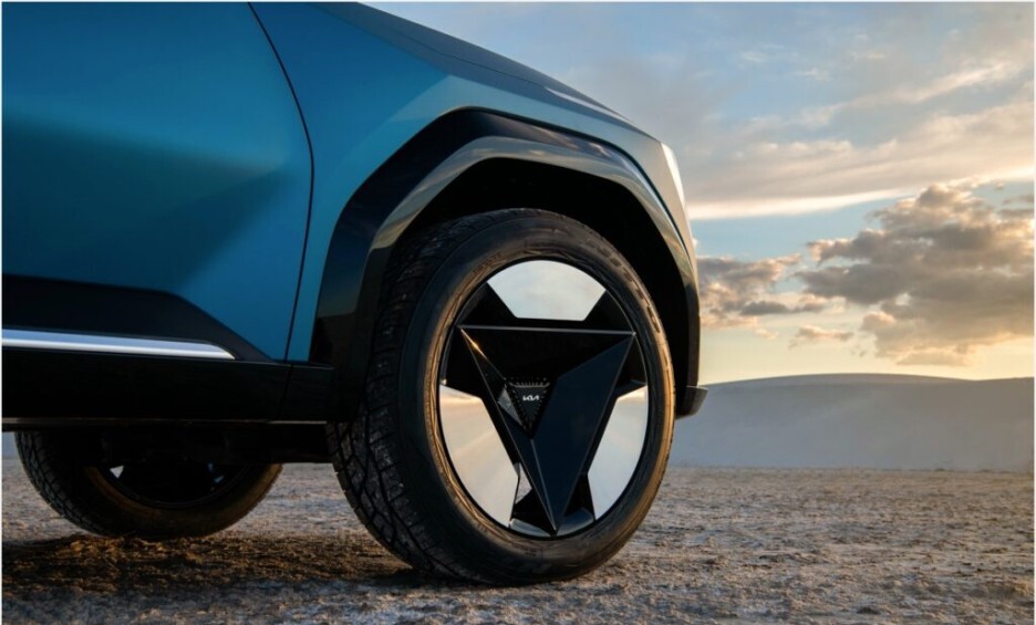 기아가 공개한 EV9 콘셉트의 휠은 삼각형 디자인으로 이런 디자인은 세단이 아닌 SUV 차량만에 적용되는 디자인입니다.