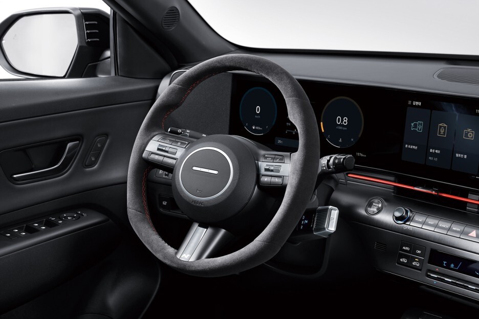 테스트 차량에서 포착된 스티어링 휠은 최근 출시된 신형 코나와 비슷한 디자인입니다.