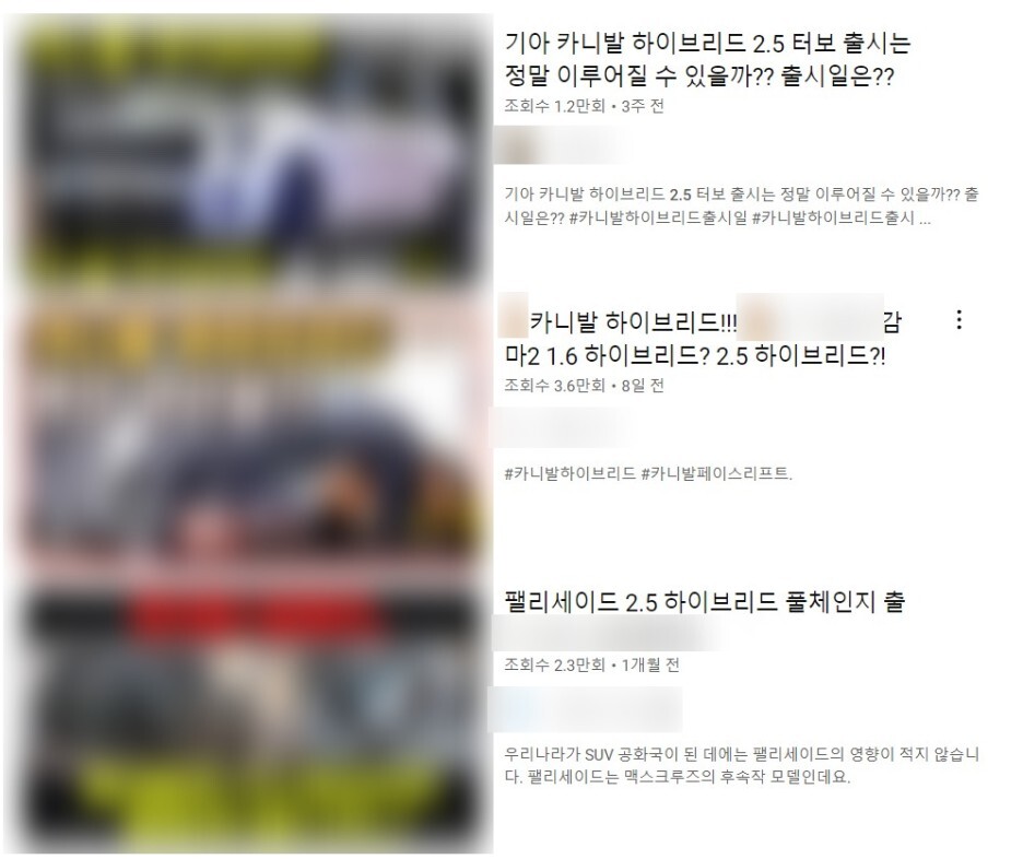 또한 유튜브에서도 카니발 하이브리드에 2.5 터보 엔진이 조합된다는 다양한 영상을 볼 수 있었습니다.