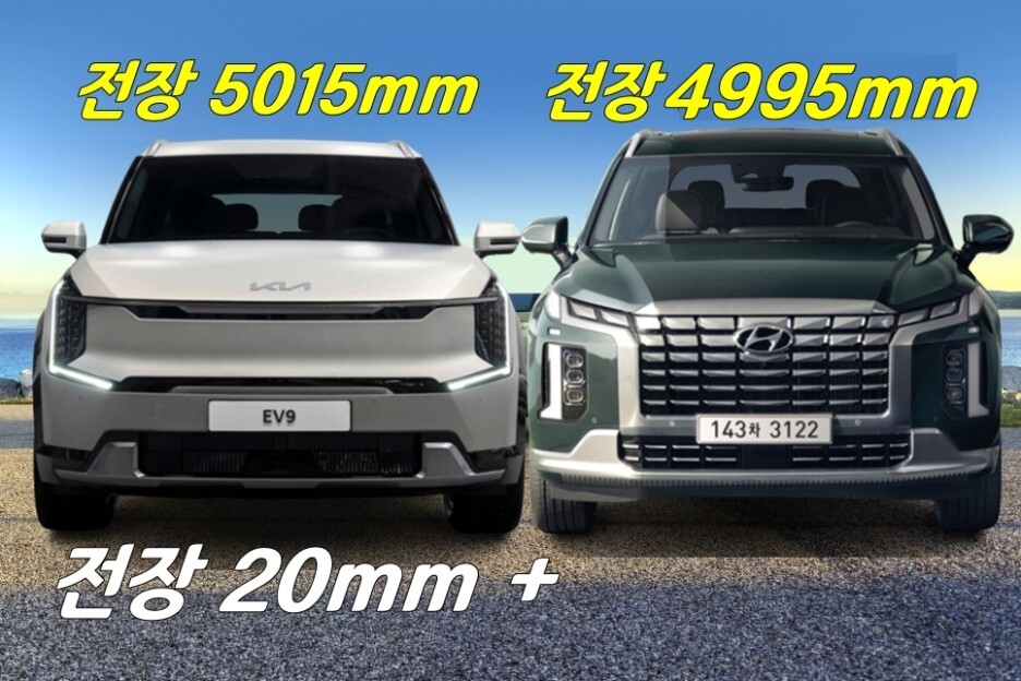 줄자의 상태나 각도에 따라서 미세한 차이가 있겠지만, 오차는 크지 않기 때문에, 전기차 EV9와 내연기관 팰리세이드의