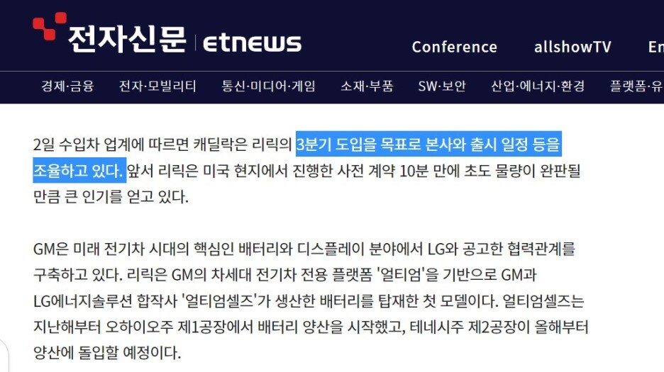 하지만 캐딜락 리릭이 당초 알려진 생산 일정 보다 9개월이나 앞당겨 생산을 시작했습니다 .