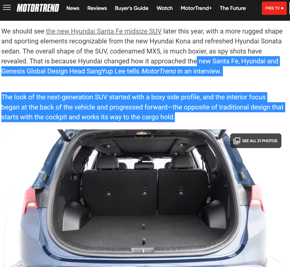 최근 해외 자동차 매체인 #모터트렌드 가 현대차그룹의 디자인 수장인 이상엽 부사장과 인터뷰 시에 신형 싼타페의 정보가 확인되었습니다.