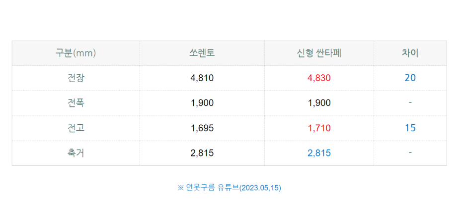 제원에 있어서 약간씩 신형 싼타페가 더 크지만 이 정도 차이는 큰 의미가 없을 것 같고 동일한 3세대 플랫폼을 적용했기 때문에.. 결론적으로 실내 공간은 대동소이할 것으로 예상됩니다.