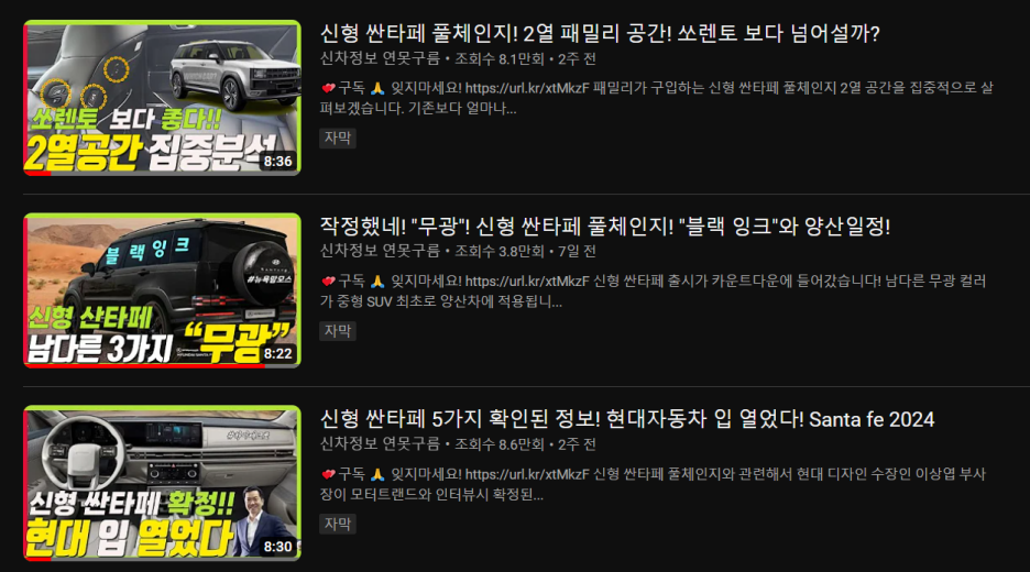 다음 영상에서는 신형 싼타페와 쏘렌토 페이스리프트의 디테일한 차이점을 체크해 보겠습니다.
