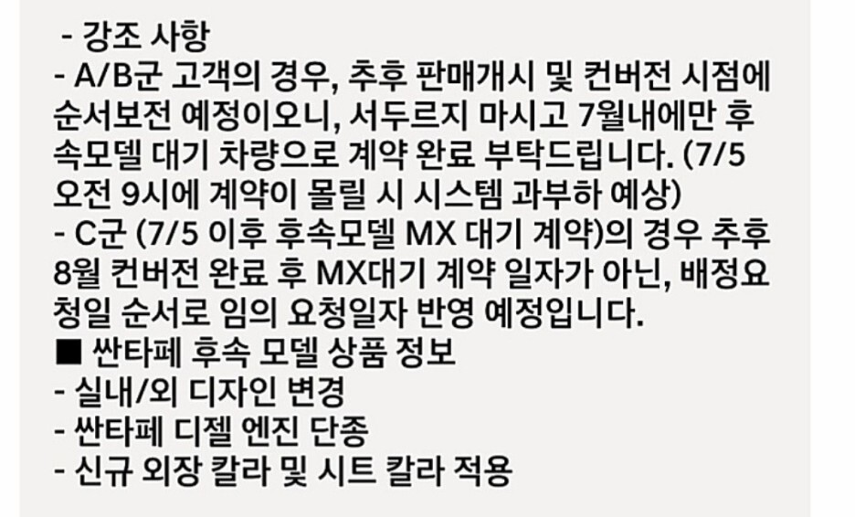 3가지 타입이 존재합니다. 첫 번째는 올해 즉 23년 4월 18일에 기존 싼타페 TM을 계약했으나 현시점까지 출고 받지 못한 분들이 신형 싼타페로 컨버전을 하는 경우 최우선 배정을 받게 됩니다. 이게 바로 A 군입니다.