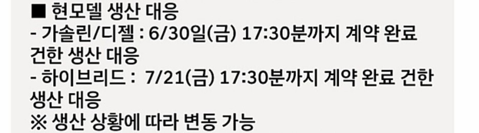기존 싼타페 하이브리드 모델은 7월 21일 17:30분까지 전산에 등록된 경우, 생산을 한다는 것으로 아직까지 시간적인 여유가 있습니다.