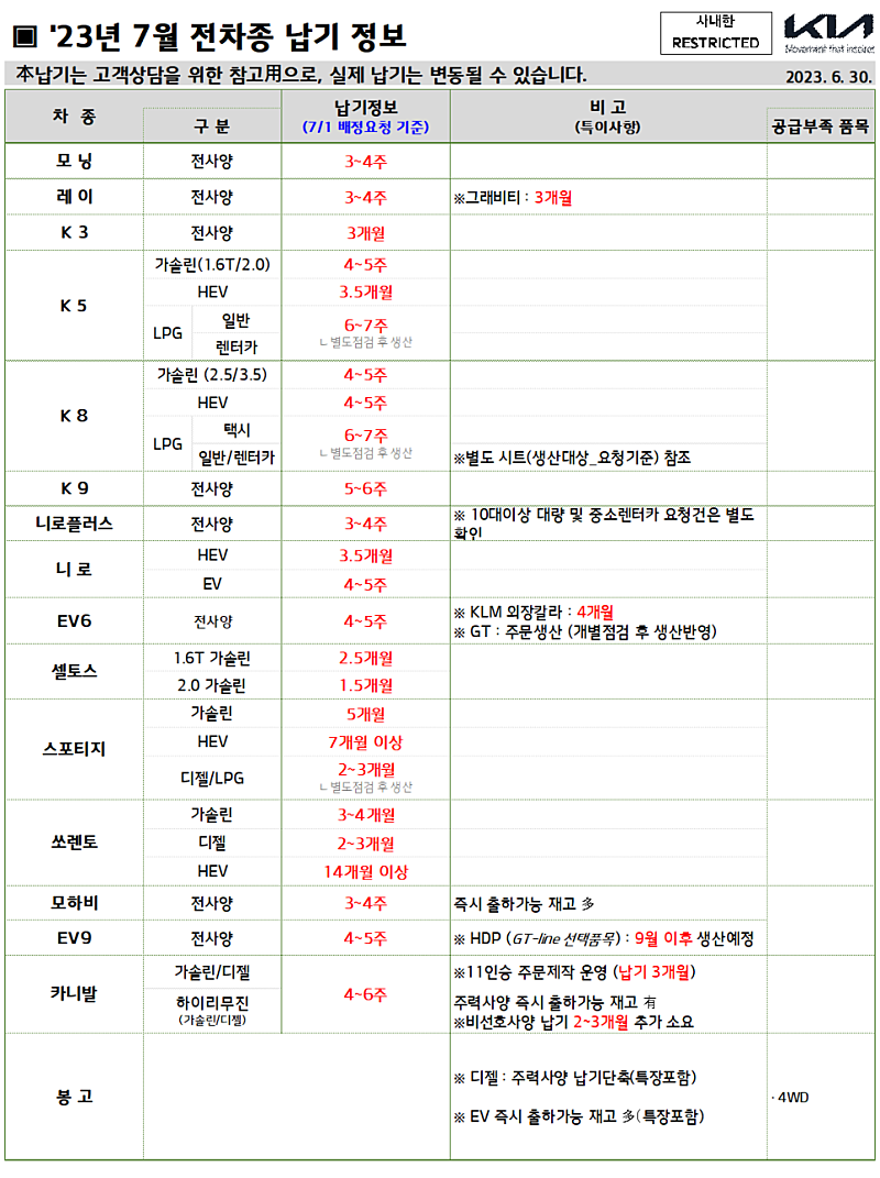 7월 현대차 납기 일정은 보면, 싼타페 차량은 조금 전에 알려드린 것처럼 단산 공지를 참고하라고 적혀있죠?