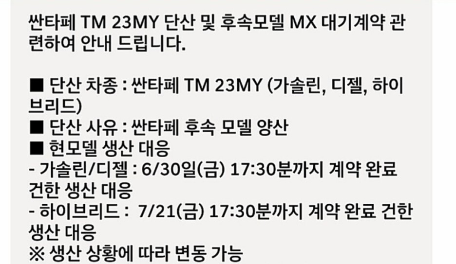 단산 사유를 보면 싼타페 후속 모델 양산이라고 정확히 언급되어 있습니다.