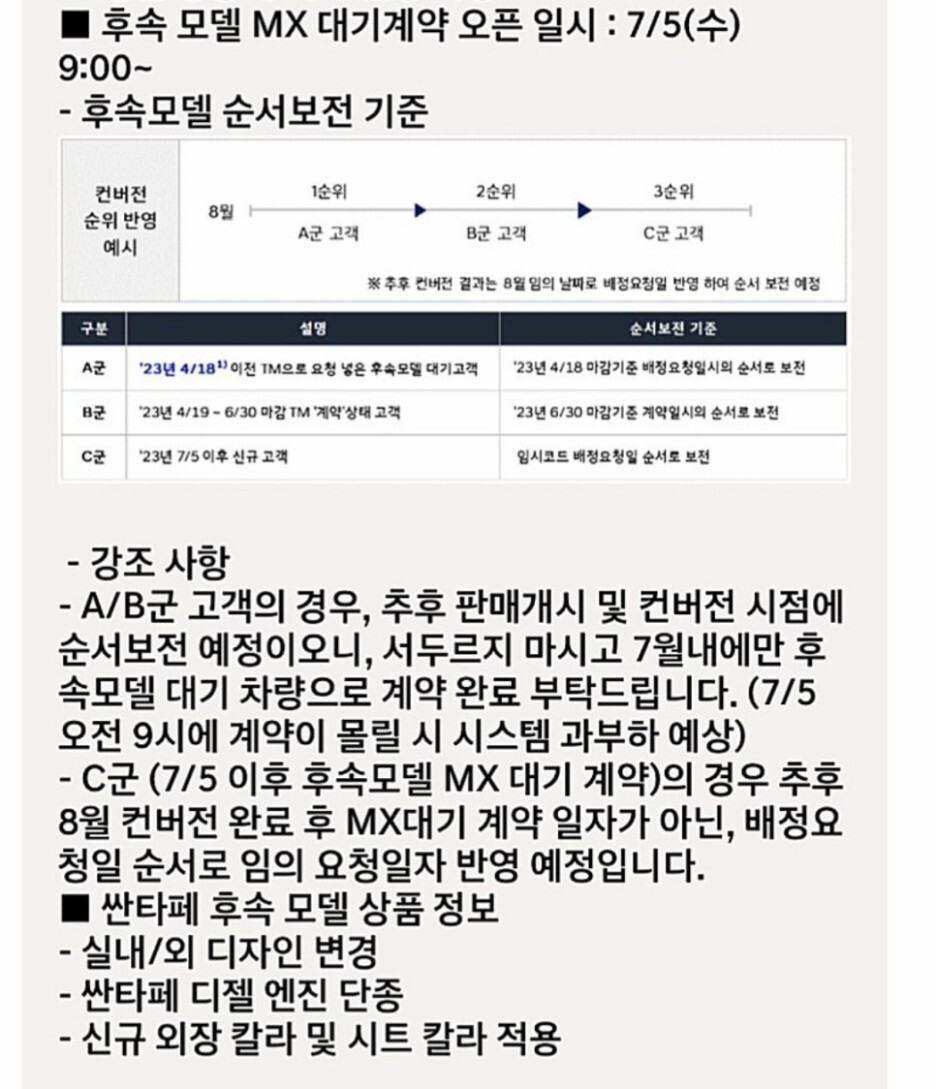 그리고 이전에 계약한 고객을 위해서 A군과 B군으로 분리해 놓았고, 추후 컨버전시에 배정 요청일 순서로 임의 요청일자를 반영한다고 공지했지만 결국 서버가 다운될 정도로 관심이 몰려있는 차량입니다.