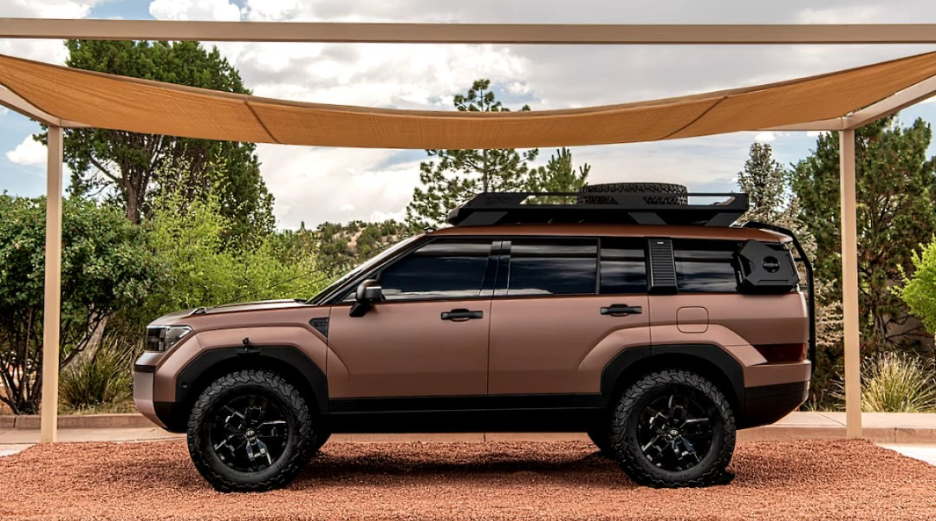 측면부는 강렬한 장갑차 같은 모습으로 따져보면, 오프로드 타이어와 루프 위에 바스켓, 그리고 C 필러에 악세사리, 뒤에 사라지만 부착한 것인데
