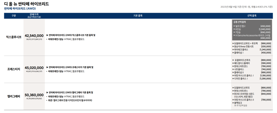 익스클루시브 4254만원, 프리스티지 4502만원, 캘리그래피 5036만원으로 처음으로 싼타페에서 기본 트림 가격이 5천만원을 넘었습니다.