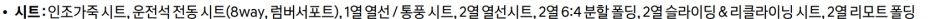 시트 사양은 소소하고 만약 동승석 전동시트 기능이 필요하면 상위 트림으로 올라가야 합니다.